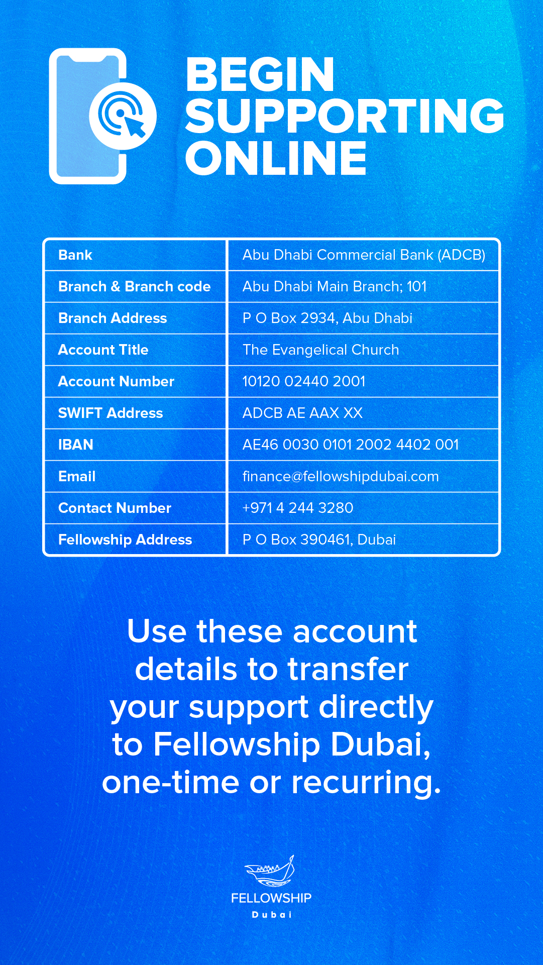 Use these bank account details to transfer your financial support directly to Fellowship Dubai. You can utilise this method for both one-time and recurring tranfers.