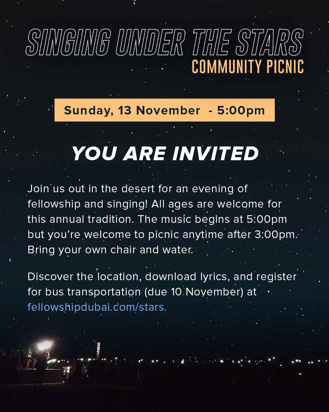 You are invited to the Fellowship family tradition (all ages welcome) of Singing Under The Stars, an annual evening of worship out in the autumn desert. The singing begins at 5:00pm but you are welcome to come and picnic anytime after 3:00pm. Bus transportation is available for 20aed round trip, otherwise a Google Map is provided below for the location. Bring your own chairs and water!