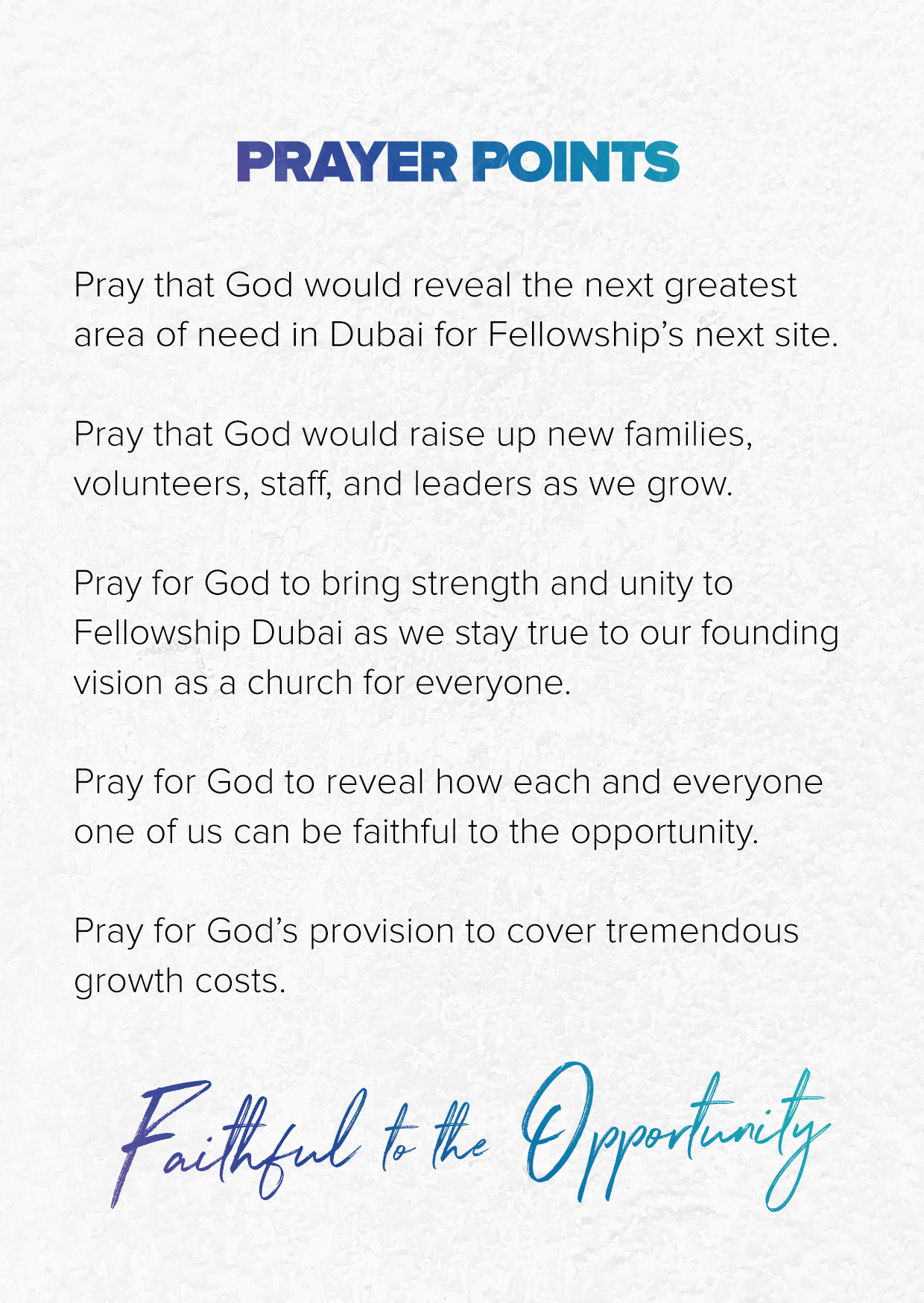 Pray that God would reveal the next greatest area of need in Dubai for Fellowship’s next site.